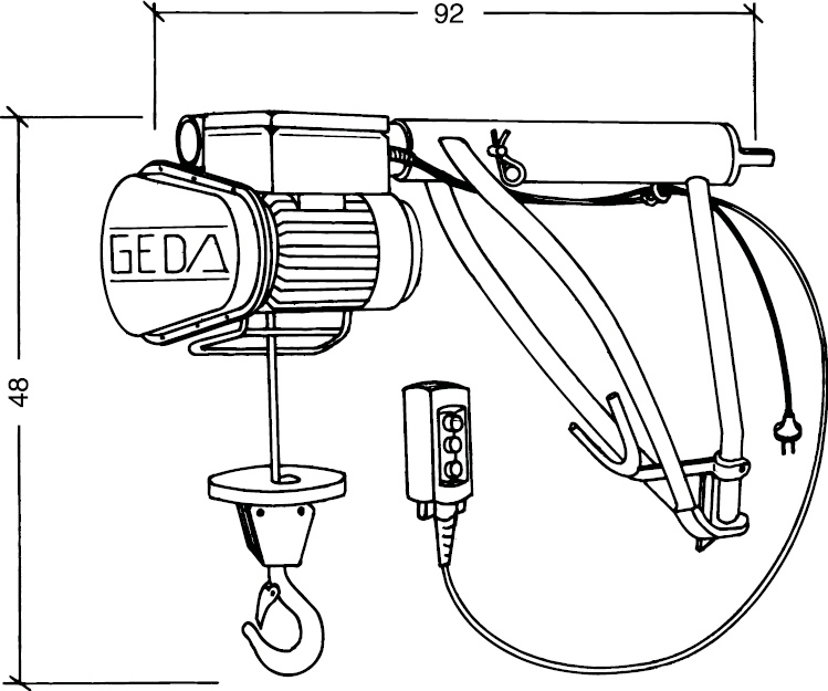 Schwenkarmzug • Tragfähigkeit bis 200 kg • Hubgeschwindigkeit 22 m/min • 1 kW/230 V/50 Hz (teilbar in Elektrowinde 44,5/46,5 kg und Schwenkarm 8,5 kg) • Steuerung mit Not-Aus mit Zugseil, Drallfänger und Lasthaken für 50 m Hubhöhe